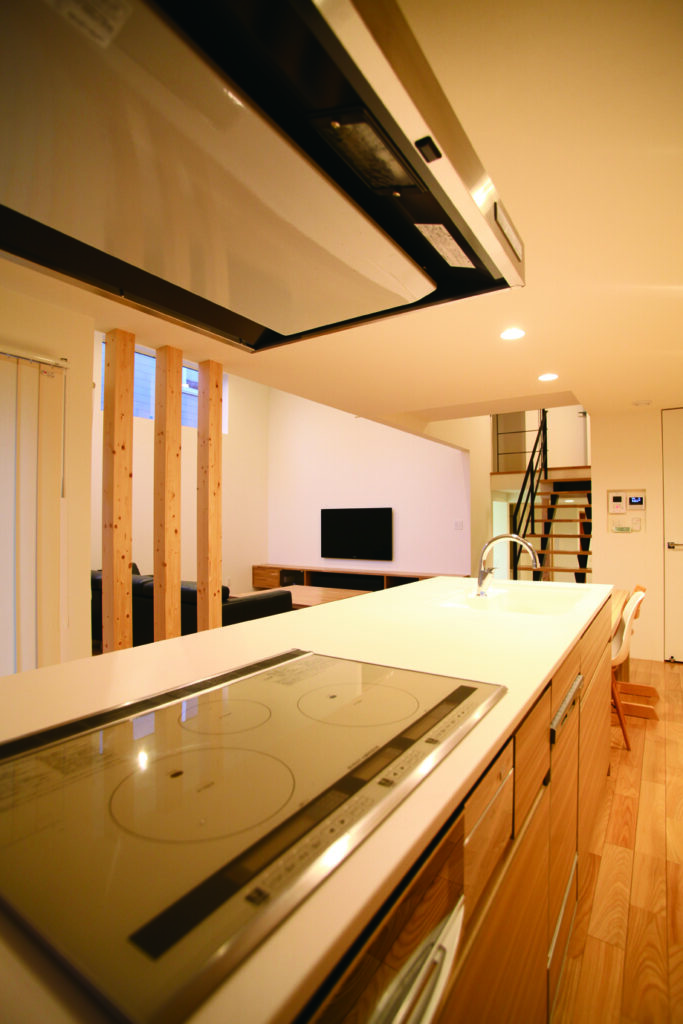 リビングとつながる開放的なキッチン。作業性とデザイン性を兼ね備えた空間。