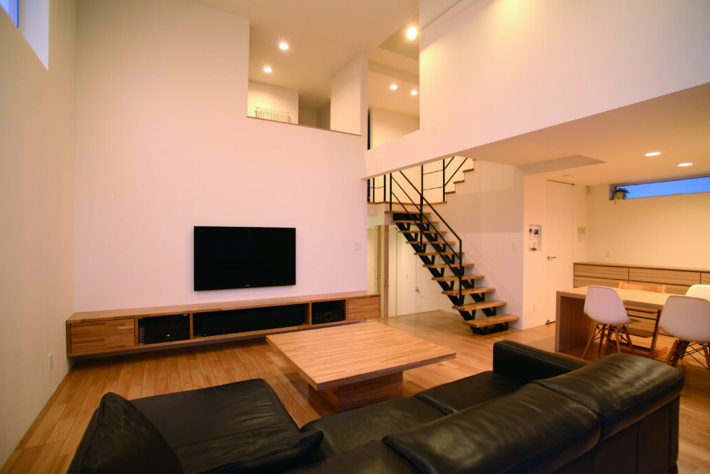 吹き抜けのある開放的なLDK空間。
