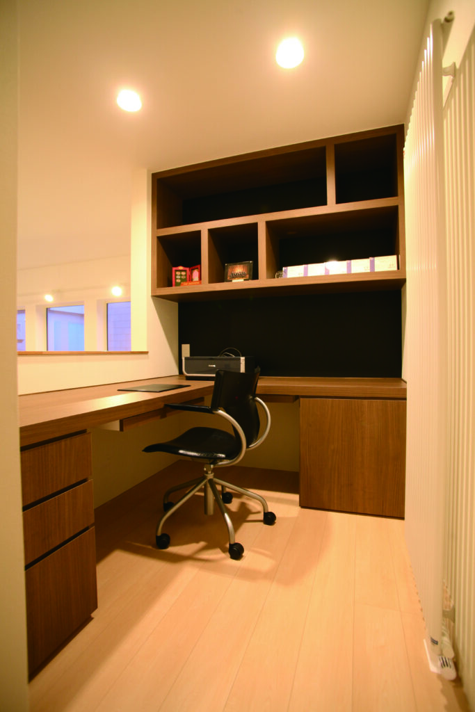 集中しやすいこもり感と収納力を備えた、使い勝手のよい造作デスク。