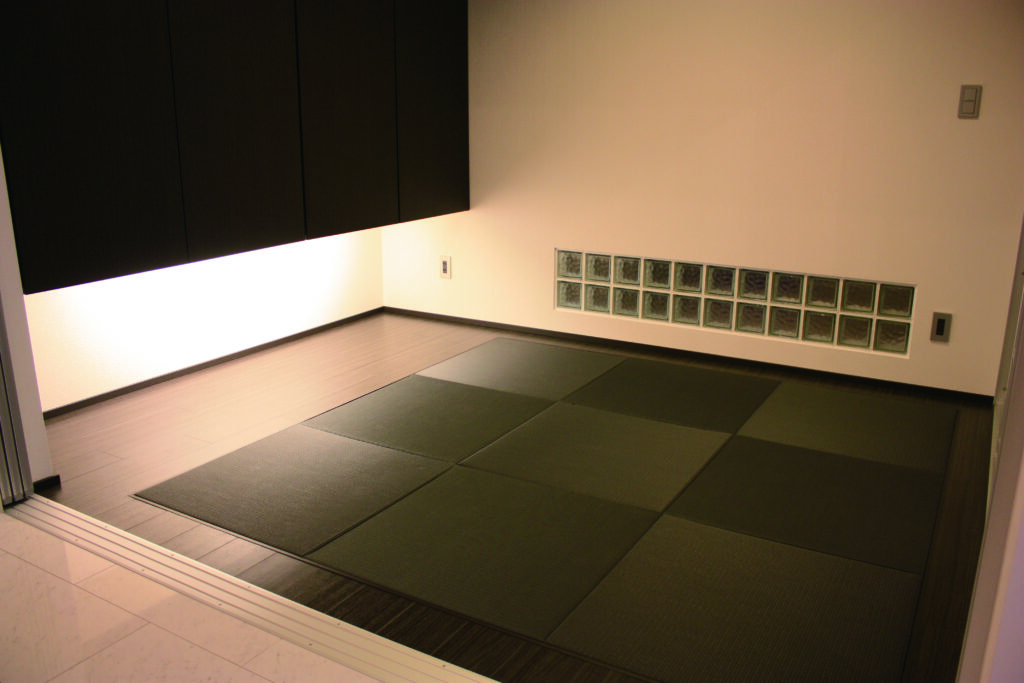 吊り収納の下に間接照明を仕込み、床の間のような落ち着きある演出に。濃色の畳とシンプルな壁面が、モダンな和の趣を引き立てています。ガラスブロックもアクセントに。