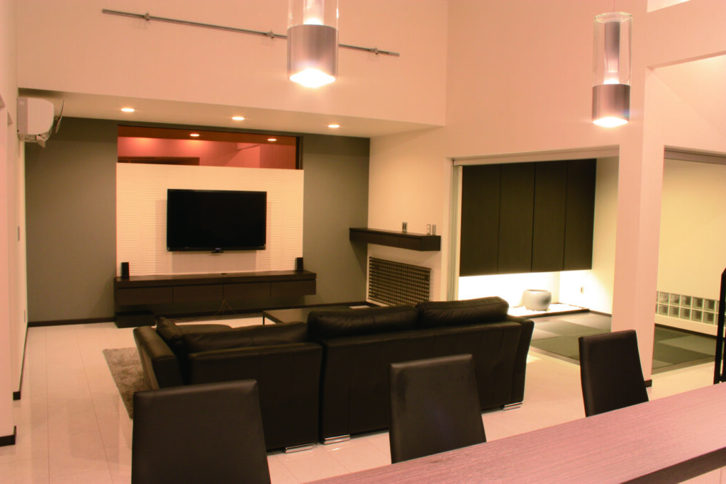 重厚感のあるレザーブラックのソファに合わせ、全体をモノトーンでまとめた空間。隣接する和室とも程よい距離感でつながっており、シーンに応じて使い分けができます。