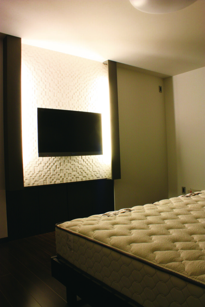 テレビ背面の立体感あるタイル壁と間接照明が、高級ホテルのような落ち着きとラグジュアリーさを演出。素材と光で印象を巧みに切り替える、上質なプライベート空間です。