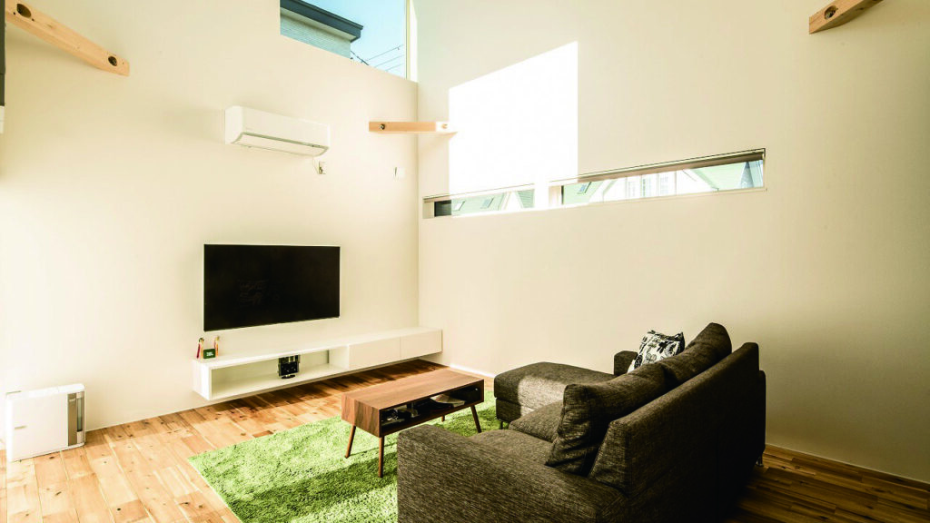 高窓からやさしく差し込む光が、白い壁面と無垢の床に反射し、明るくあたたかな空間をつくり出しています。テレビや家具は落ち着いたトーンで統一され、穏やかな時間が流れる心地よいリビングです。