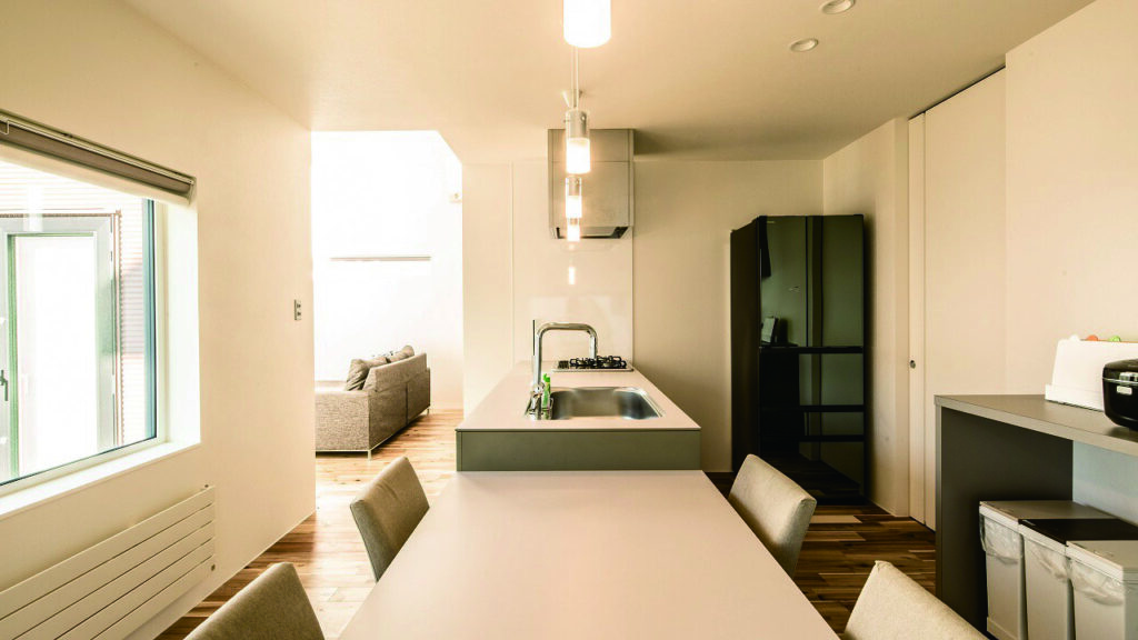 キッチンとダイニングが一直線につながるレイアウトは、毎日の家事動線を効率的にしつつ、家族との距離感も近づけてくれます。天井からのペンダント照明が、空間にさりげないリズムを与えています。