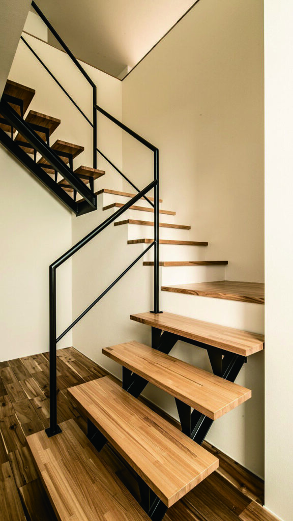 木のステップと黒のアイアンフレームを組み合わせた階段は、空間を引き締めるアクセントに。視線が抜ける開放的な構造で、住宅全体の軽やかさを損なわず、上階へ自然に導きます。