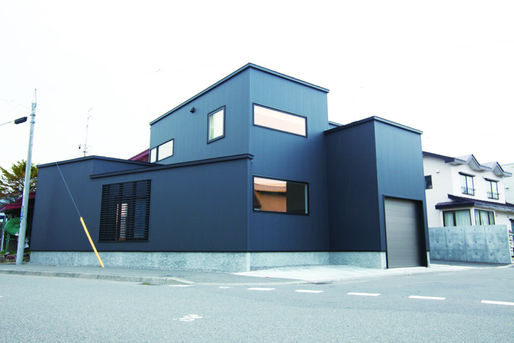 直線的な構成が印象的な外観。ガレージを中心に構成されたフォルムは、プライバシーを守りつつも力強さを感じさせます。