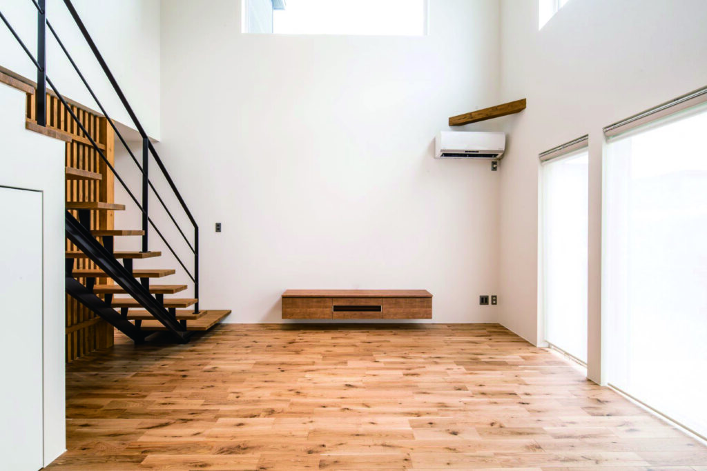 視線が抜ける吹き抜けと、軽やかなスチール階段が印象的なリビング。余白を活かした設計が、暮らしの自由度を広げます。壁面にはシンプルなテレビボードを設置し、すっきりとした印象に。