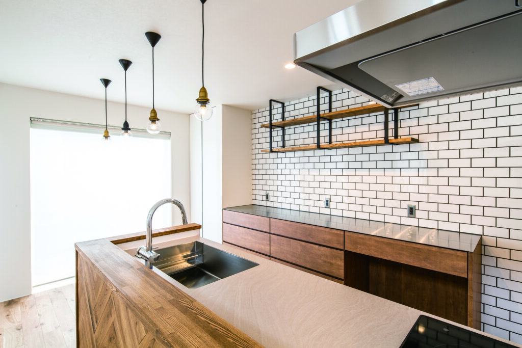 存在感のある木のヘリンボーンカウンターと、白いタイルの美しいコントラスト。アイアンの棚受けと木製の棚板が程よいヴィンテージ感を演出し、カフェのような雰囲気に。