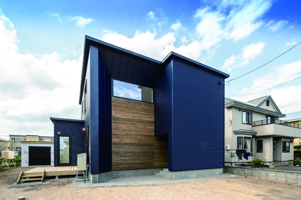 ネイビーの外壁と木張りが織りなす、印象的な正面デザイン。