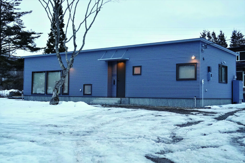 平屋ならではのどっしりとした佇まいが印象的な外観。ブルーグレーのガルバリウム外壁とフラットな屋根が、現代的な雰囲気を演出しています。
