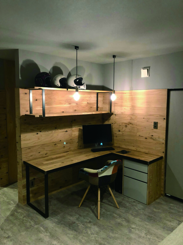 ヘルメットが並んだ上棚やパッチワークチェアが、住まう人の個性と趣味をさりげなく表しています。