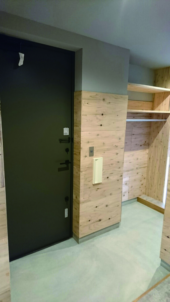 室内に入った瞬間から木の香りに包まれるような、温もりのあるお出迎え空間に。壁面収納も設けられ、使い勝手にも配慮されています。