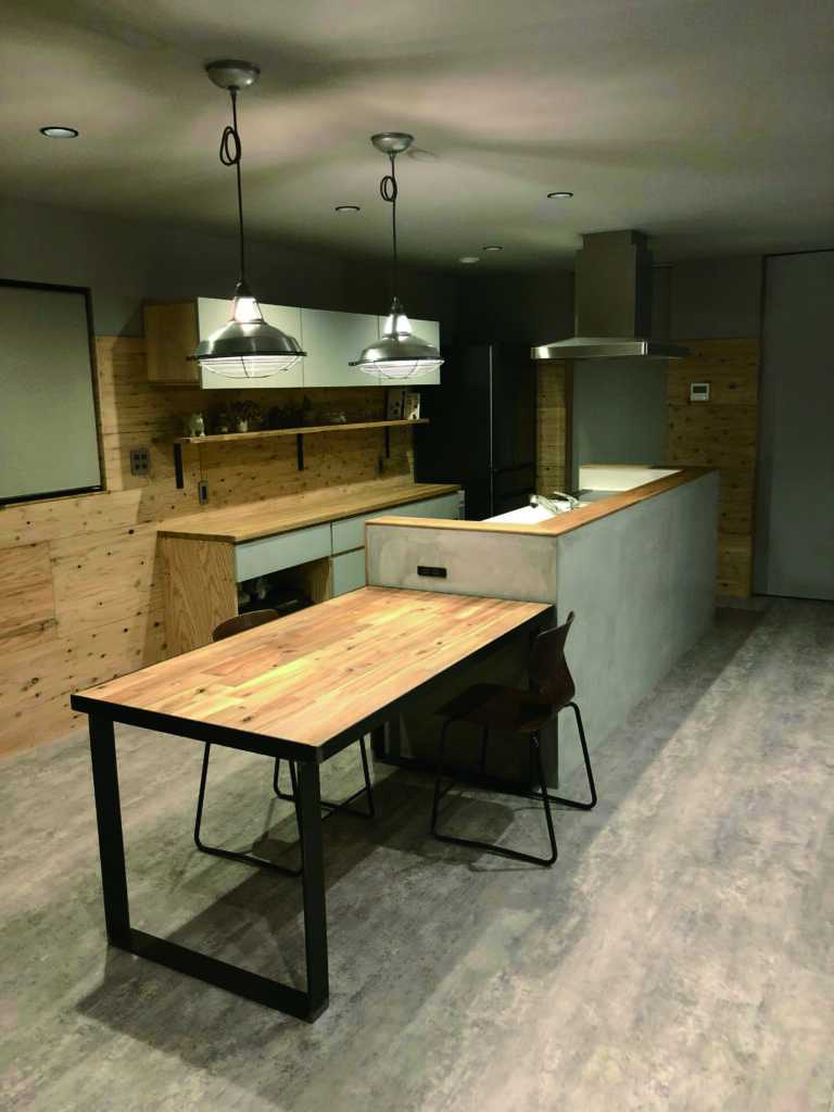 L字型のデスクは作業効率を高め、天井から吊るされた照明が程よい明るさを演出。