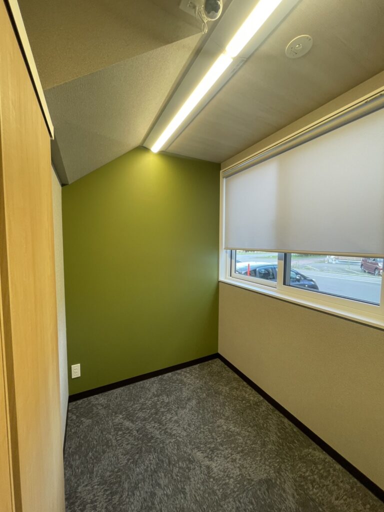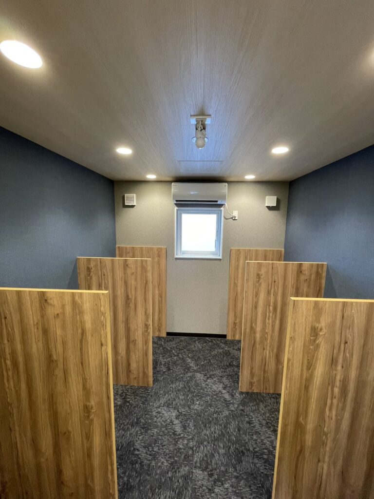 小さな空間でも落ち着いて過ごせるように、照明や配色を工夫。塾の中で「自分だけの場所」を確保できる設計です。