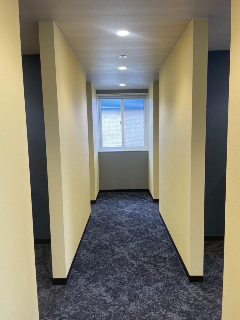 落ち着いたグレーのカーペットと柔らかい木目天井、イエローのアクセントウォールが印象的な空間。来塾した生徒や保護者が明るい気持ちになれるような配色に。安心感と透明性を大切にしたレイアウトになっています。