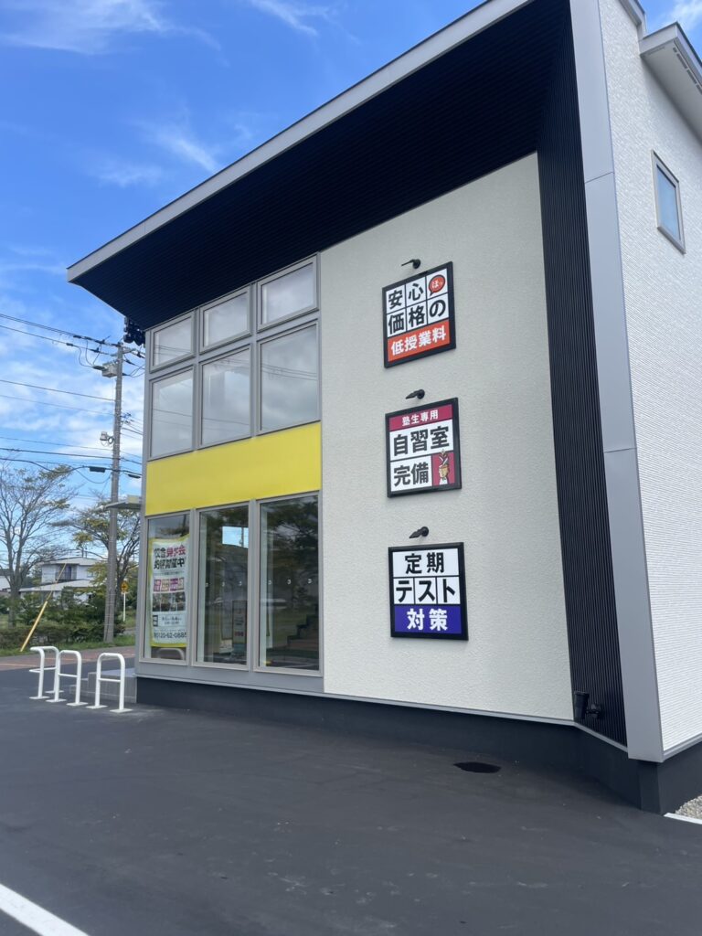モダンな外観。黄色のアクセントカラーがブランドイメージと調和し、通りすがりでも目を引くデザインです。大きな窓と正面のロゴサインが塾の存在感を高め、地域に開かれた学習の場としての安心感を表現しています。