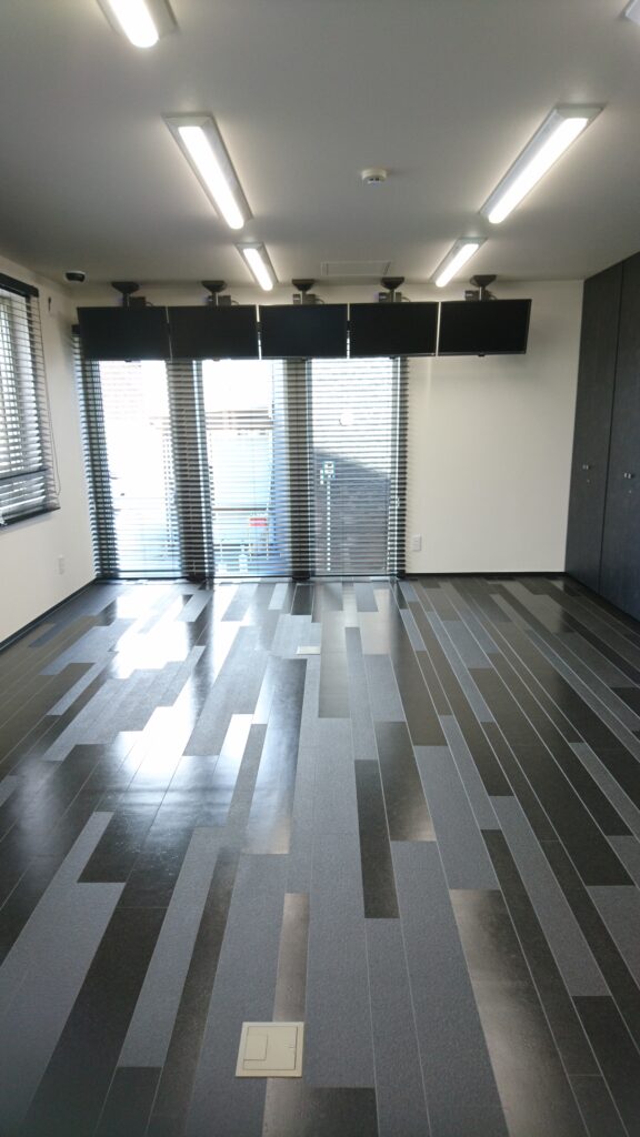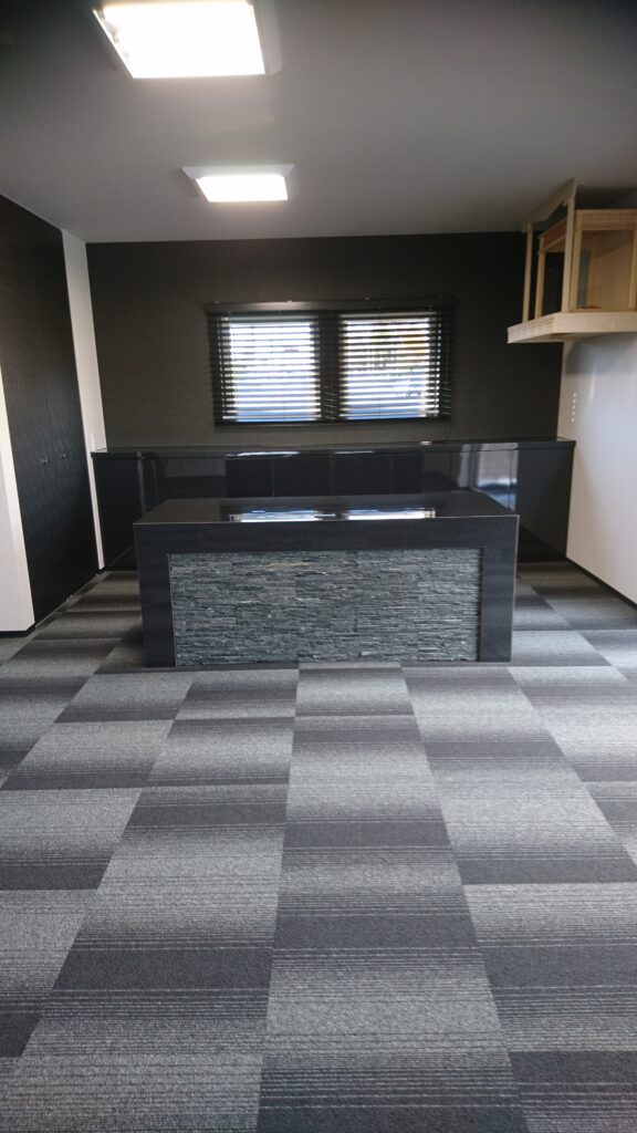 床にはグラデーションのあるタイルカーペットを使用し、濃淡の美しさと耐久性を両立。